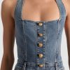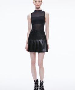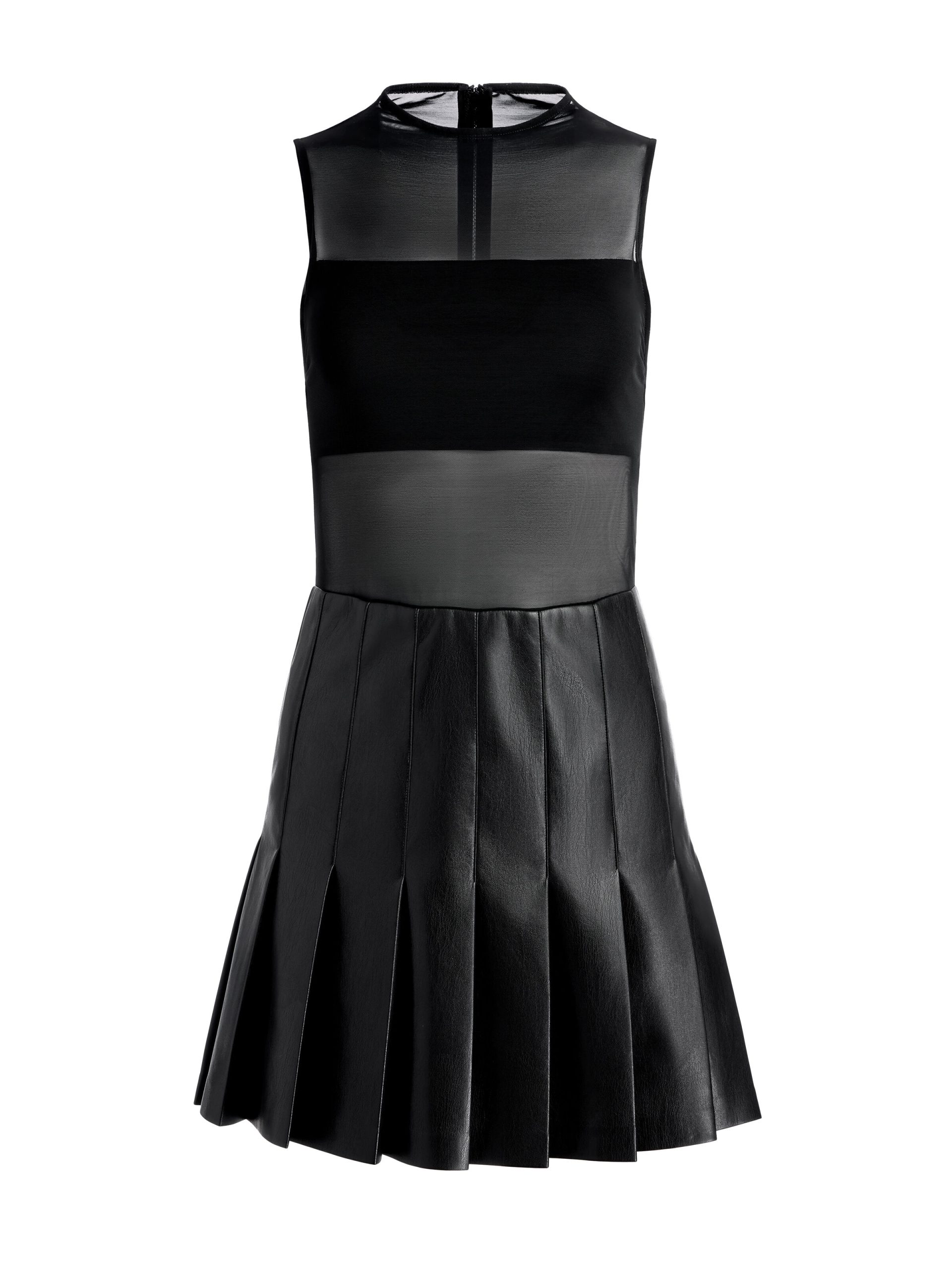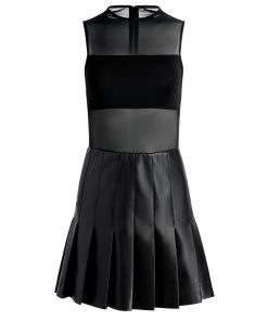 This sleeveless mini features a crewneck, mesh bodice, and a vegan leather pleated skirt. We love it for anything from date night to night out.