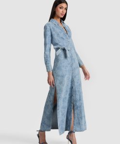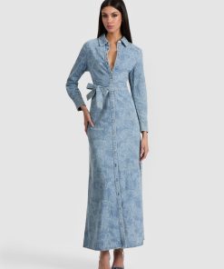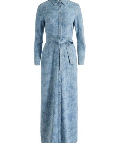 A denim moment that’s anything but basic. This version of the Chassidy maxi is cut from printed cotton denim with a paisley motif, finished with long sleeves, a belted waist, and a full skirt for maximum swish. It’s casual, but with that dressed-up energy-think poolside gossip turns country club cocktails.