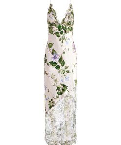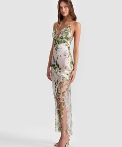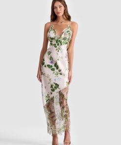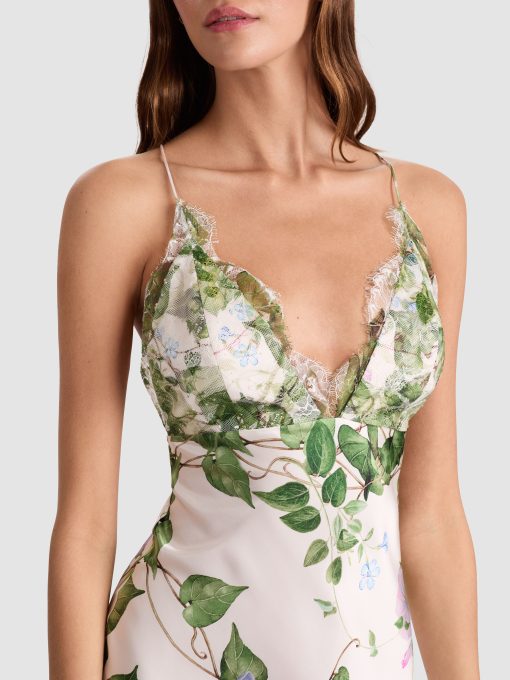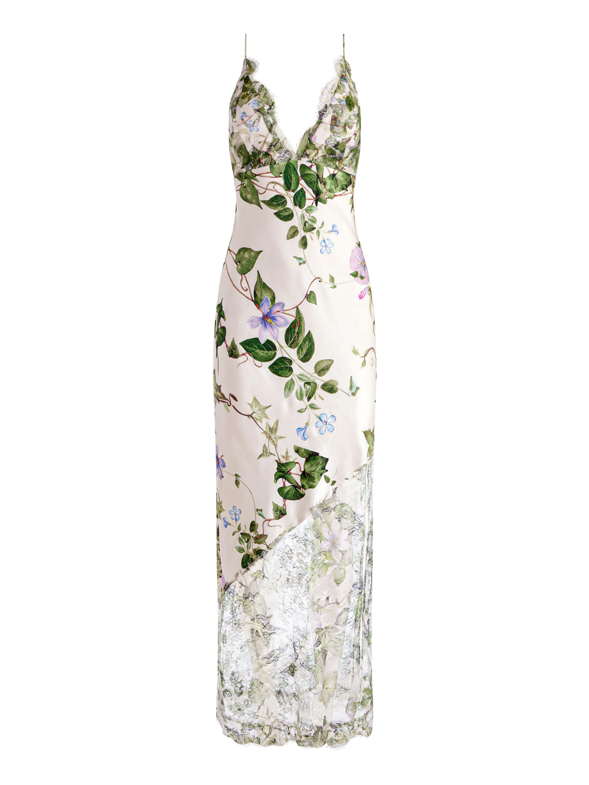 Ivy plants hold symbolic meanings of eternity, fidelity, and attachment. Their evergreen nature and ability to cling to structures represent everlasting love, faithfulness, and a strong, enduring connection. Claudia is cut from printed viscose charmeuse with an asymmetric lace cutaway, open back, and romantic ivy pattern. It floats, it drapes, it stuns-and the lace detail guarantees compliments wherever you go. Think: garden party, beach wedding, or anytime you want to feel like the main character.