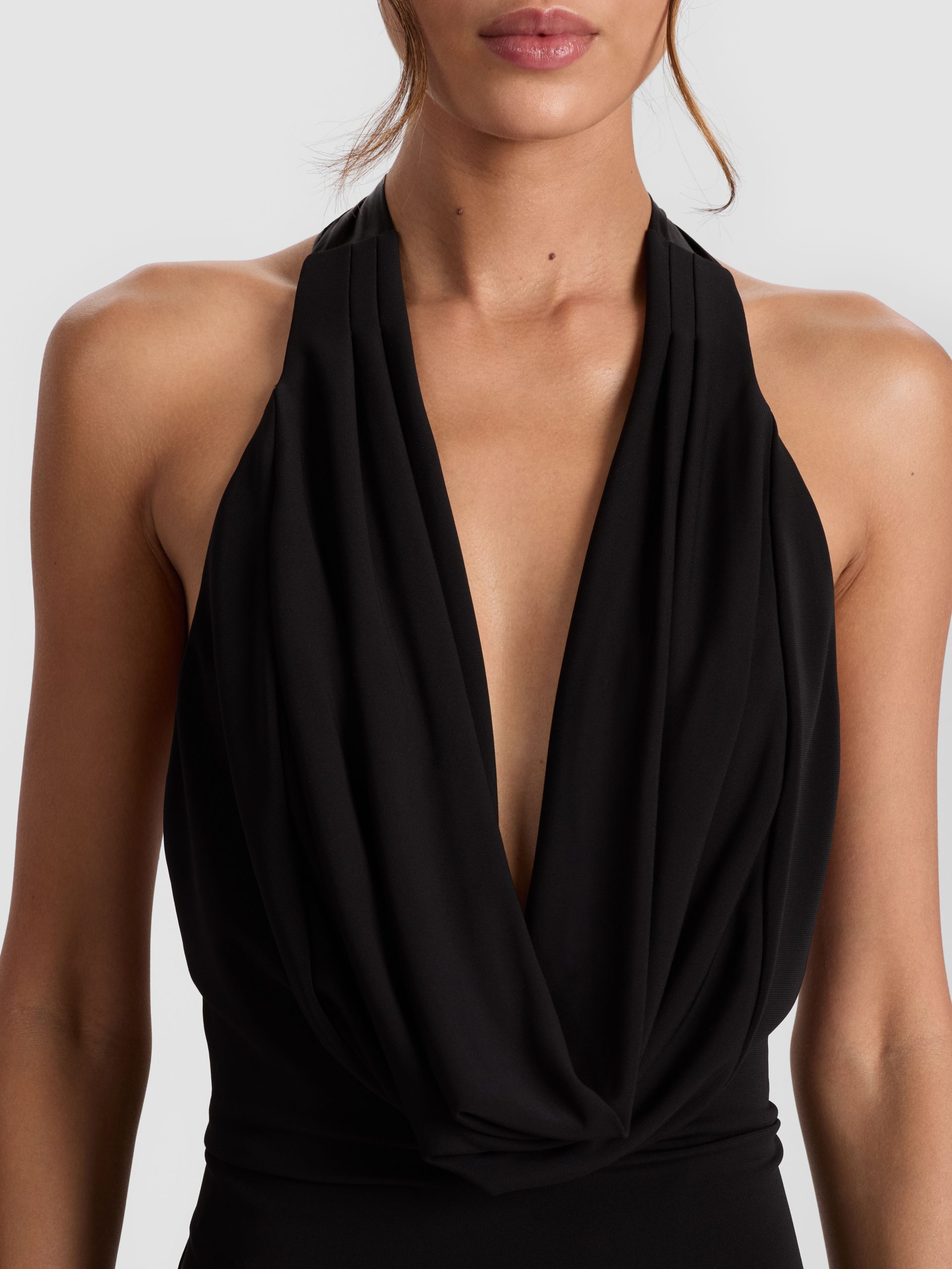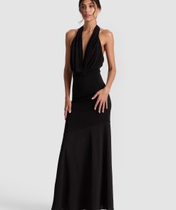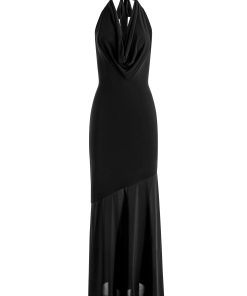 Sleek, sculptural, and made to turn heads. The Dani dress features a draped cowl neckline, open back halter tie, and asymmetric seaming that reveals a sheer chiffon panel for unexpected movement. With its mixed-media construction and dramatic silhouette, it’s pure evening energy-and worthy of any RSVP.