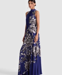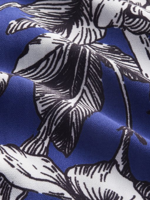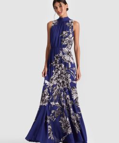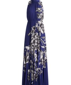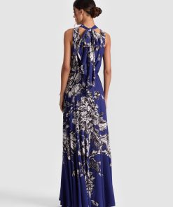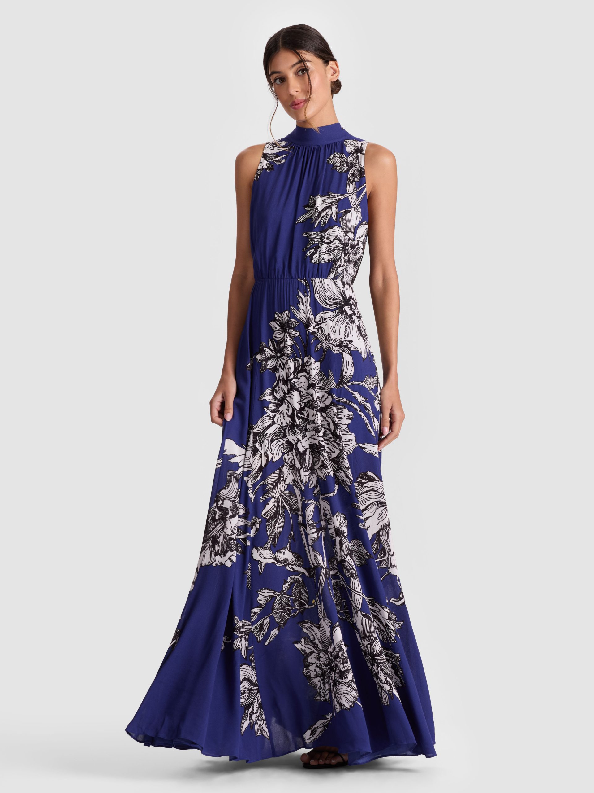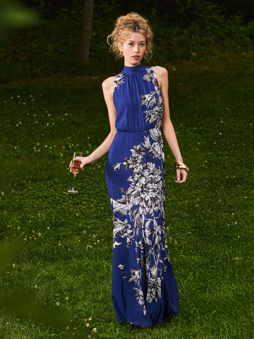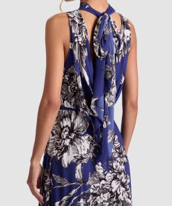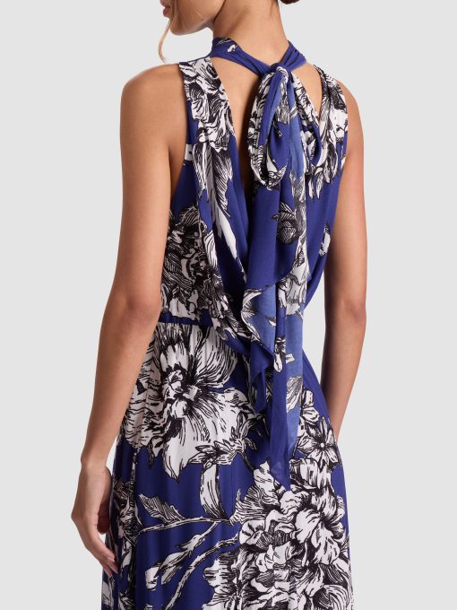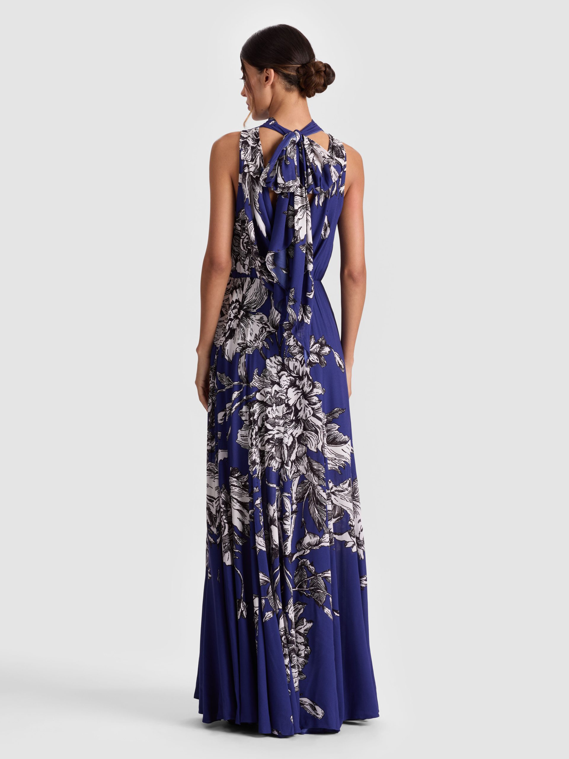 A showstopper in motion. The Dita is crafted in flowing viscose with a pleated godet skirt and a dramatic open cowl back that ties at the nape of the neck. The tie can be styled multiple ways-loose and draped or snug and secure-for your preferred level of reveal. Printed in blooming wild indigo, this one brings soft drama and endless twirl to summer nights.