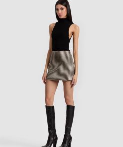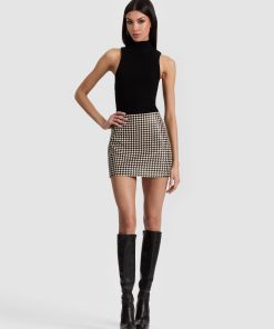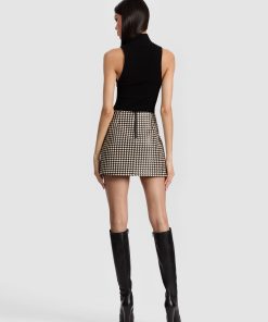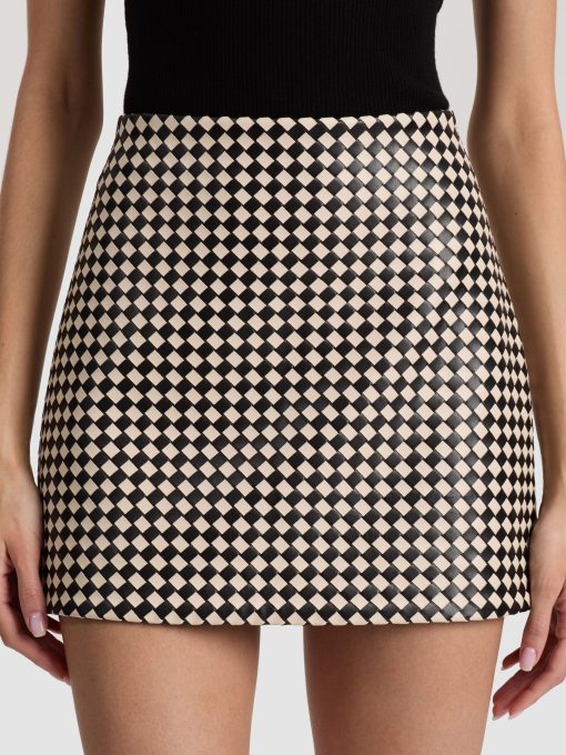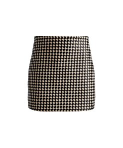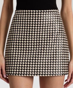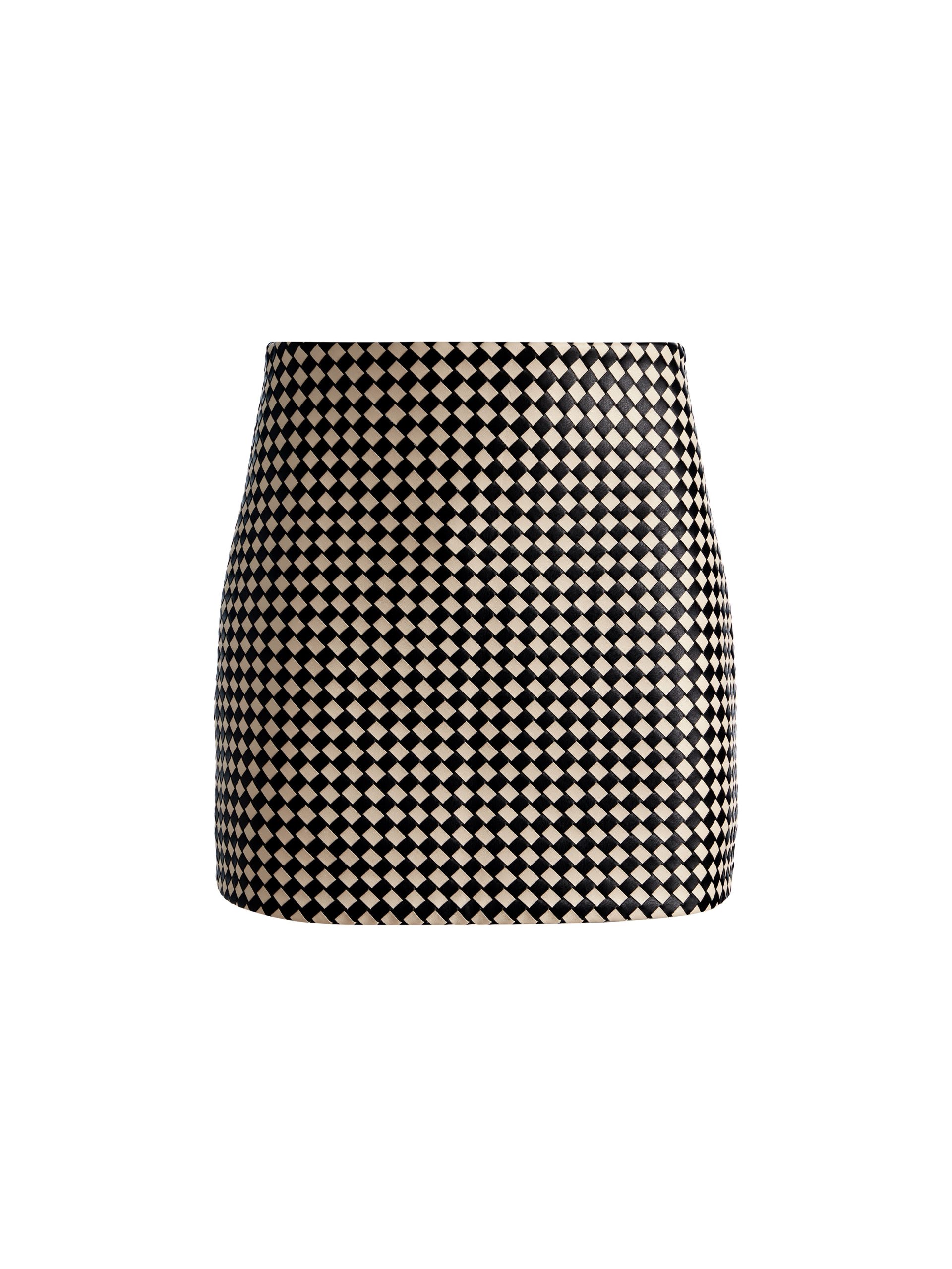 The it-girl mini, reimagined. The Elana skirt is made from lasercut strips of alternating vegan leather, woven together to create a basketweave look. Wear it with the matching Logan coat for an ultra-polished twinset, or pair it with a baby tee and sneakers for off-duty TK vibes.