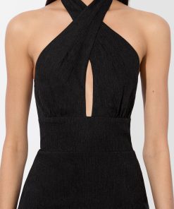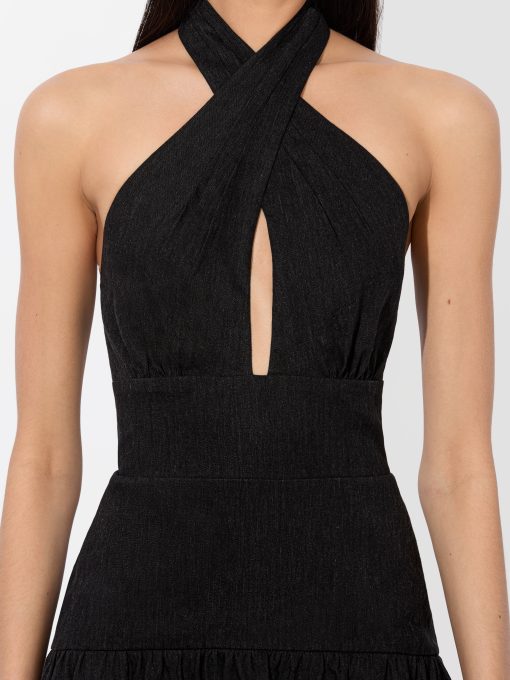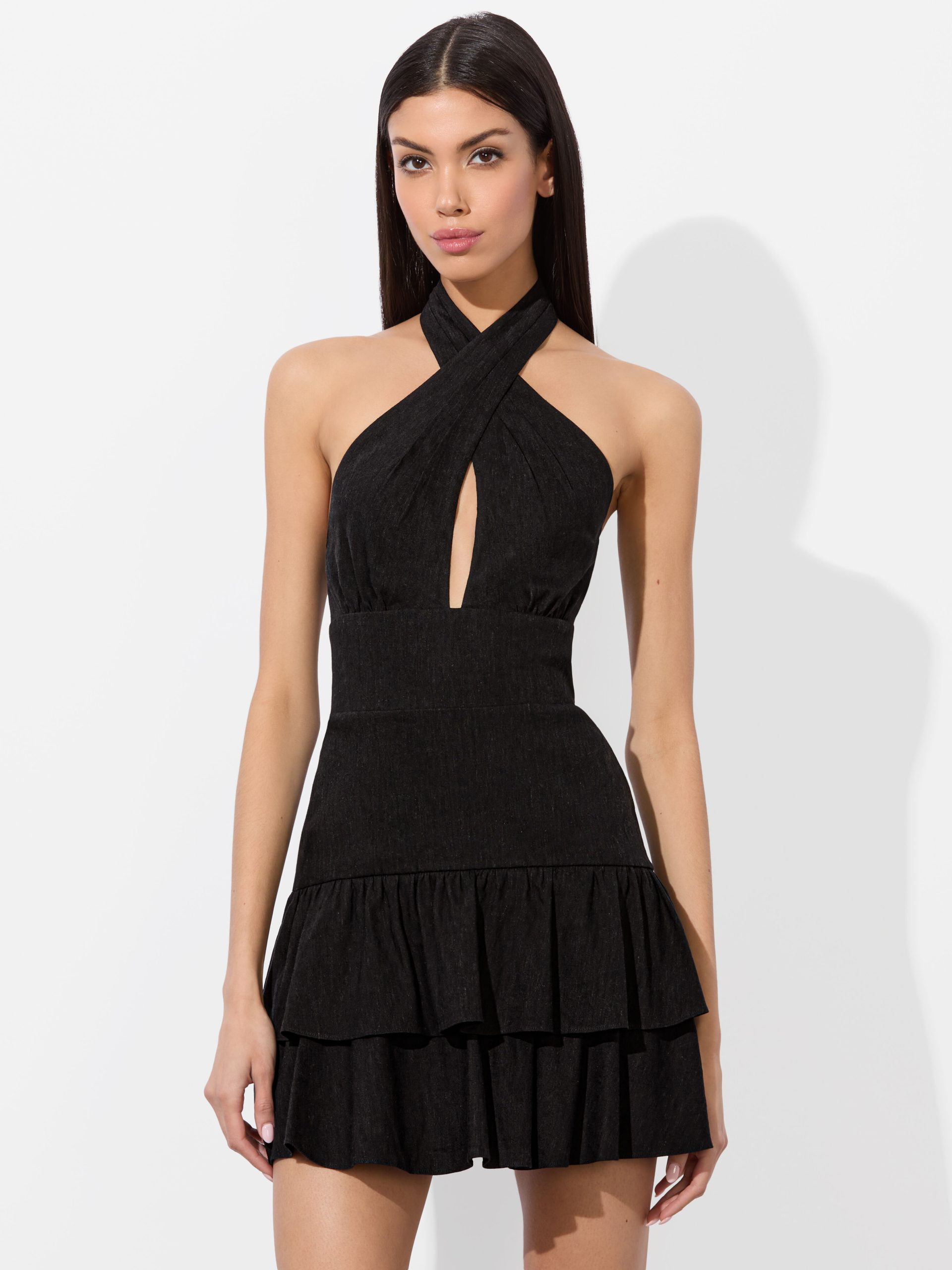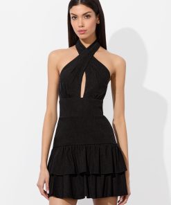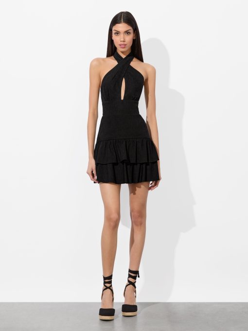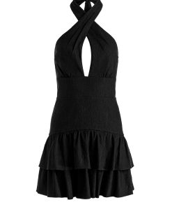 Meet the mini version of our beloved Evelina gown. With the same twist-neck halter and center keyhole, this one cuts off above the knee and finishes with a fluttery ruffle hem. Crafted in lightweight linen with a touch of stretch, it’s a go-anywhere, dance-everywhere piece that brings the drama in a shorter package.
