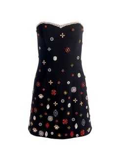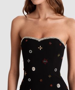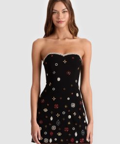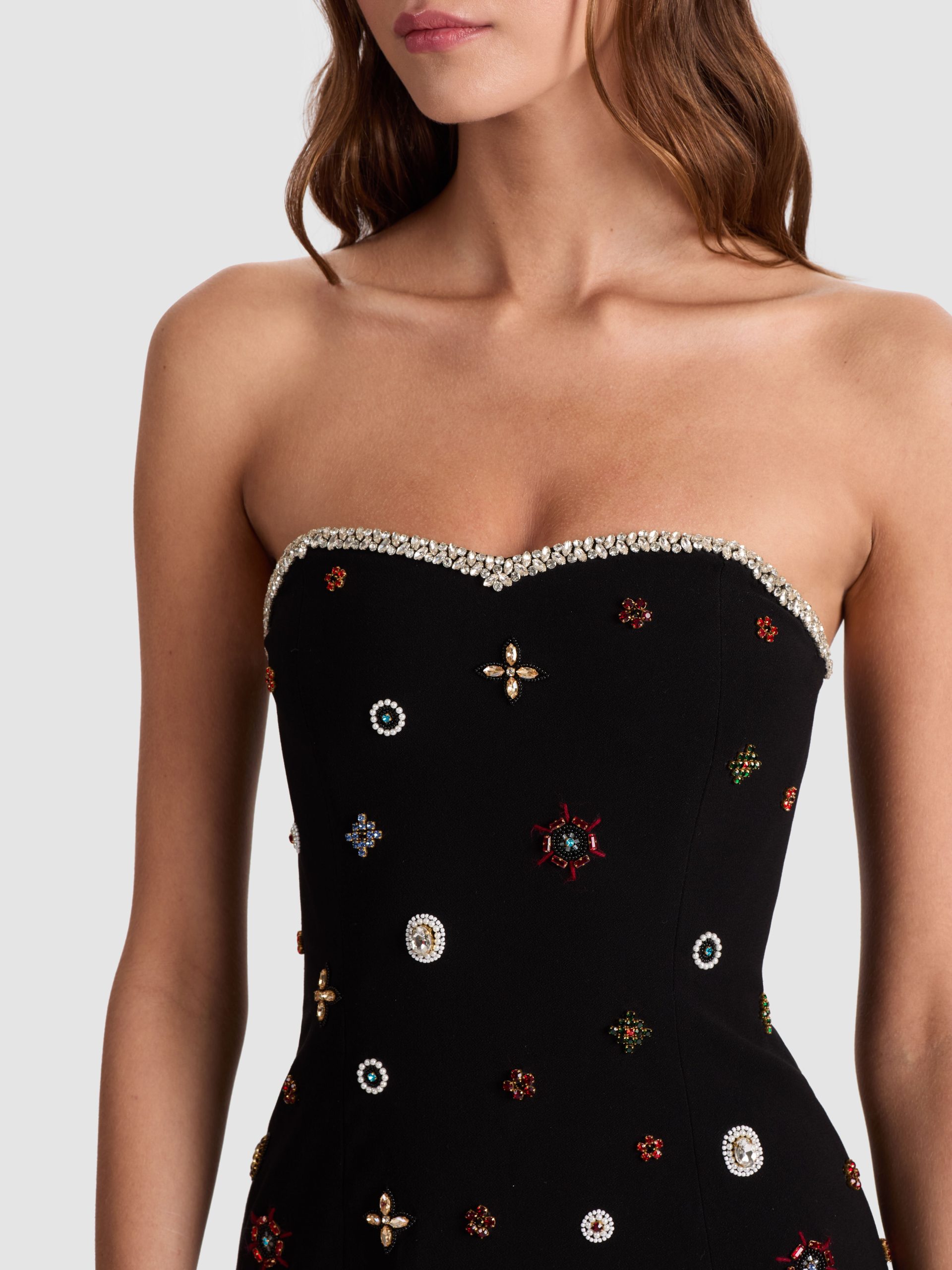 When jewelry meets tailoring. Cut from matte satin that sculpts without squeezing, the Iva mini is embellished with 3D crystal clusters that catch the light (and compliments). An internal corset keeps the strapless bodice perfectly in place, so you can dance, toast, repeat-no adjusting required. It’s your RSVP-ready, party-starting piece.