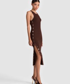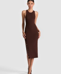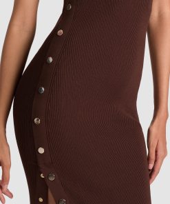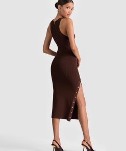 Sleek, sculpted, and built for impact. The Lalita dress is a curve-hugging midi crafted in a soft, stretchy rib knit with a sporty racerback and clean crew neckline for an off-duty model vibe. Snap buttons crawl down one side from hip to hem- wear them fully closed for a streamlined look or undone to show a little leg. Just add slicked-back hair and sneakers (or stilettos) and go!