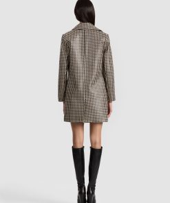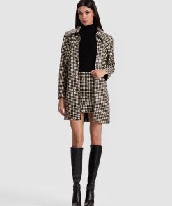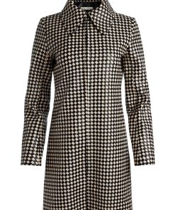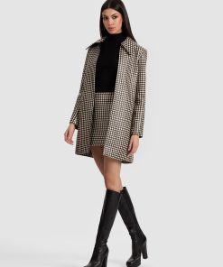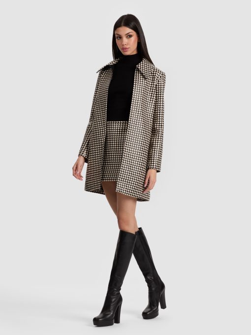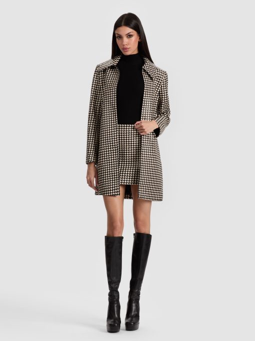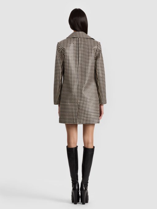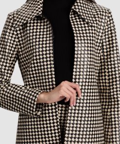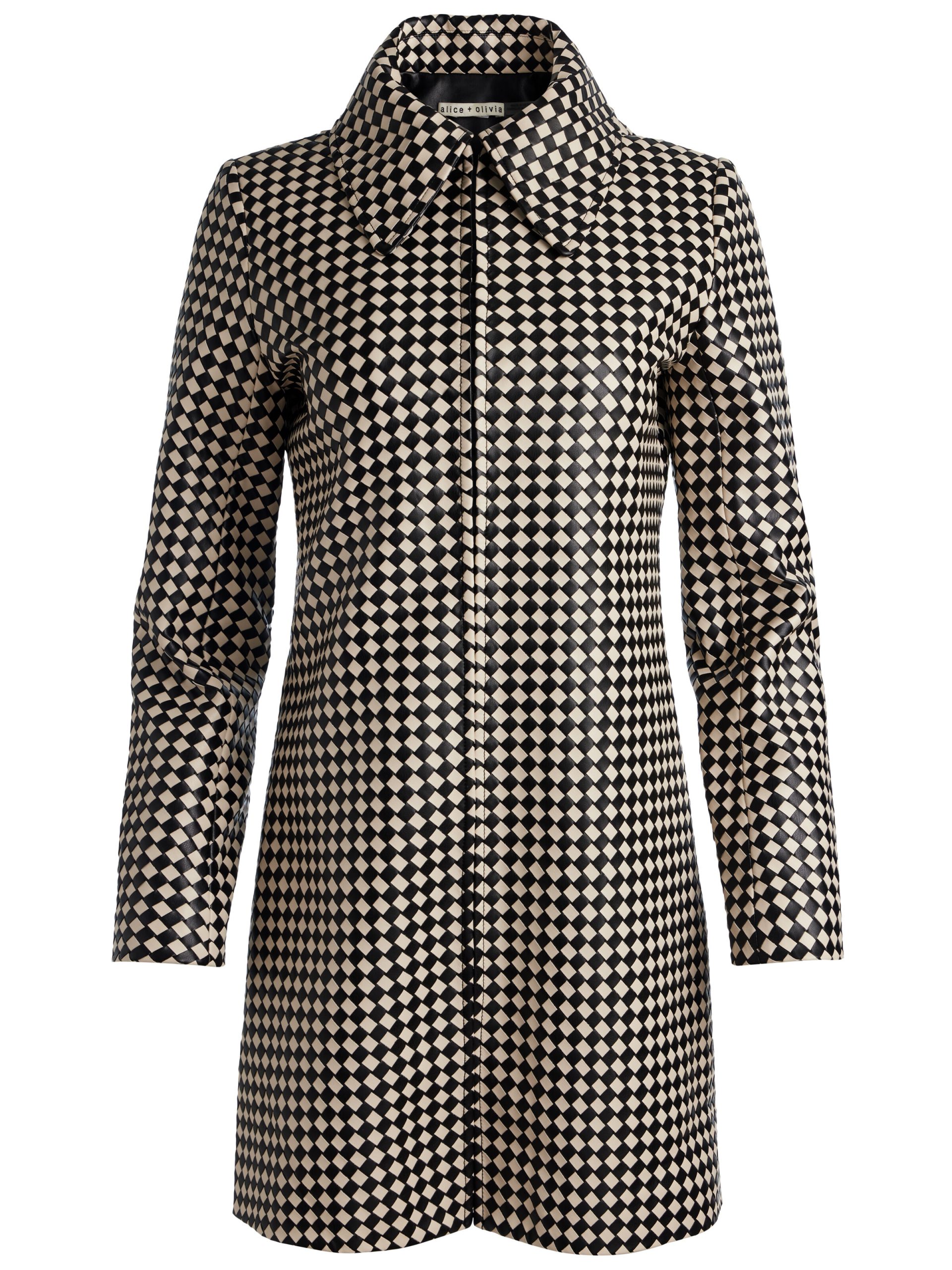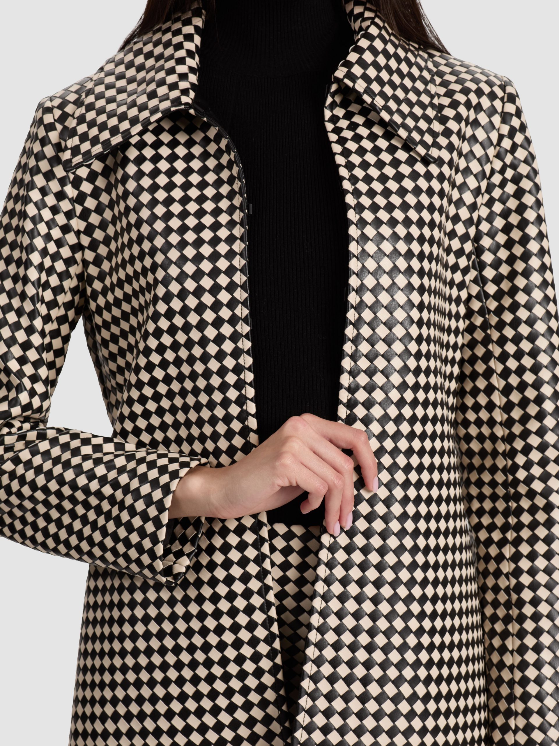 Outerwear that makes the whole outfit. The Logan coat is made from lasercut strips of alternating vegan leather, woven together to create a basketweave look. It has a checkered texture, sleek collar, and hook front closures. Fully lined and perfectly mid-length, it’s a bold finish over all-black-or go full look with the matching Elana mini skirt.