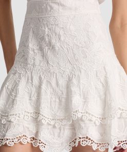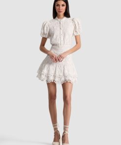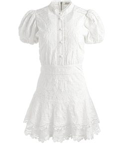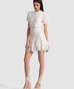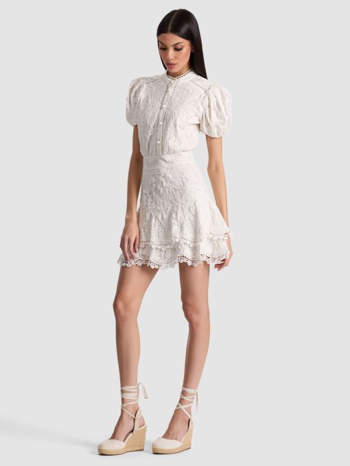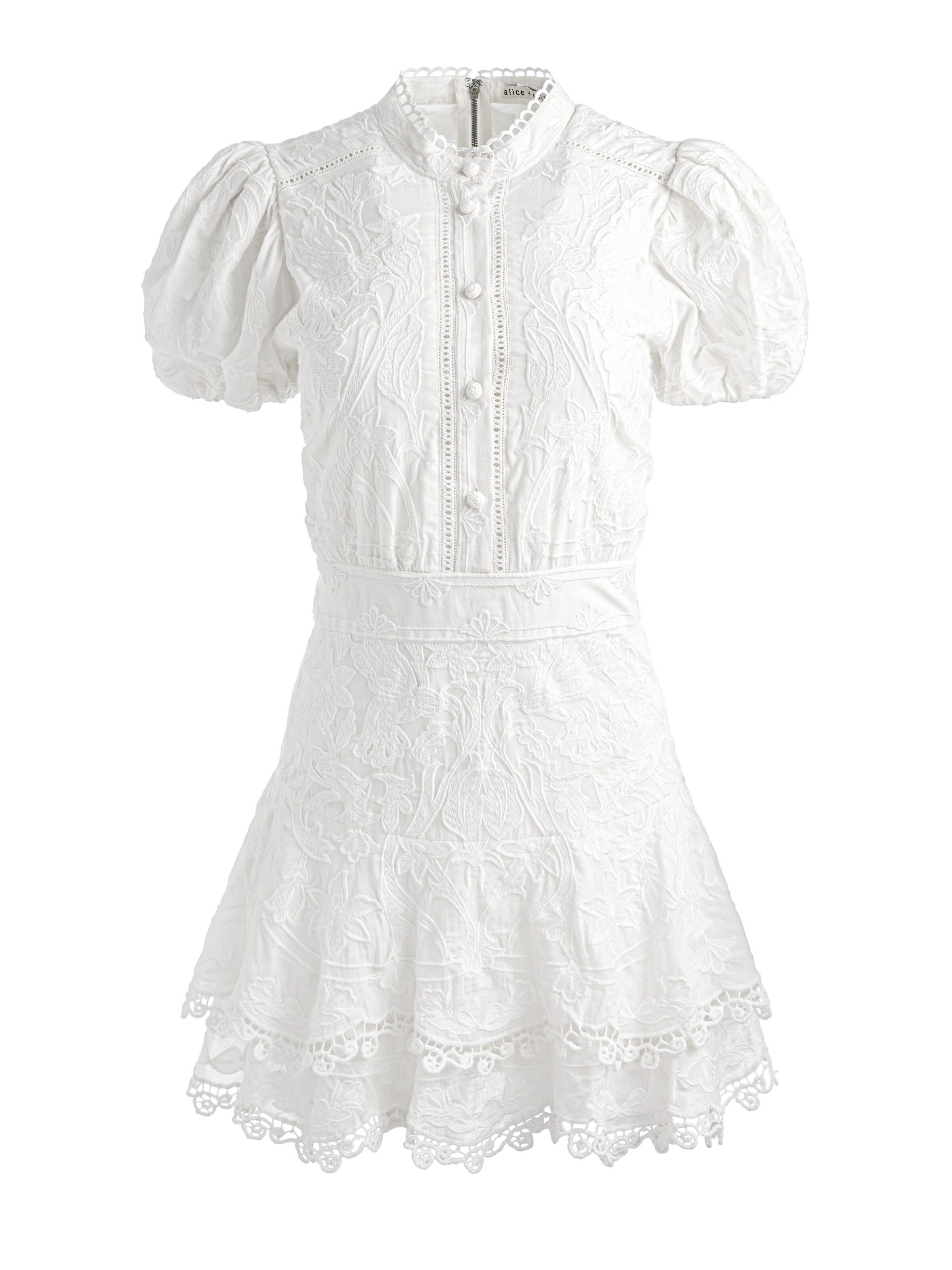 Loryn is the dress you’ll reach for when you want to look instantly polished. Equal parts sweet and structured, it’s crafted from ornate embroidered cotton voile with puff sleeves, a mock neck, and a tiered mini skirt. Fully lined and ready for bridal showers, graduations, and every RSVP in between.