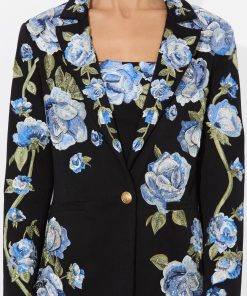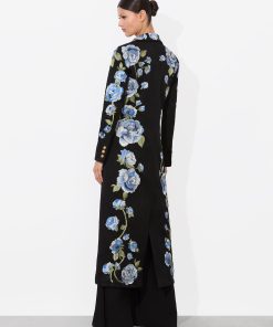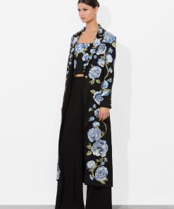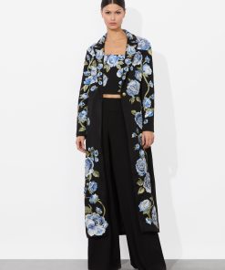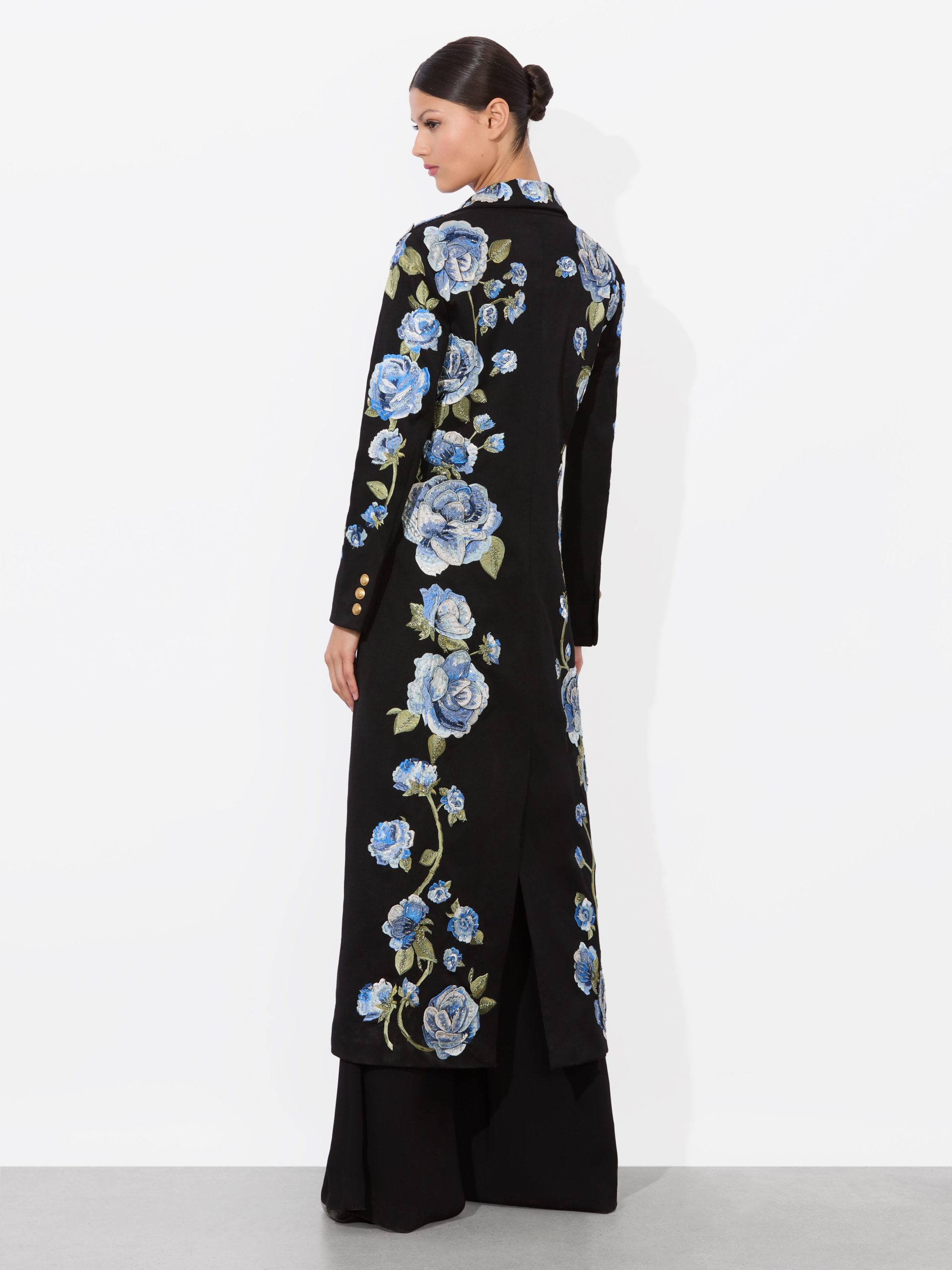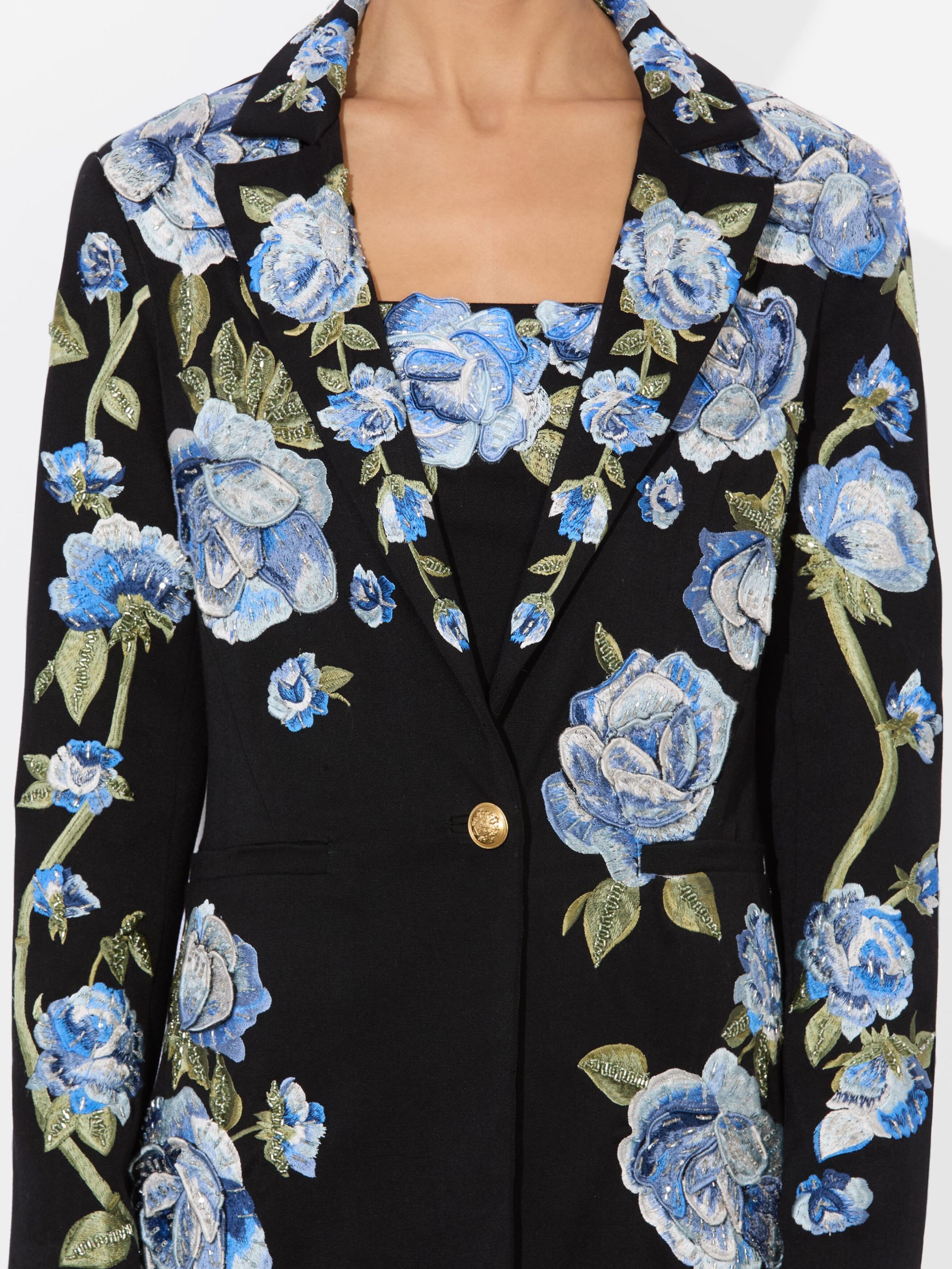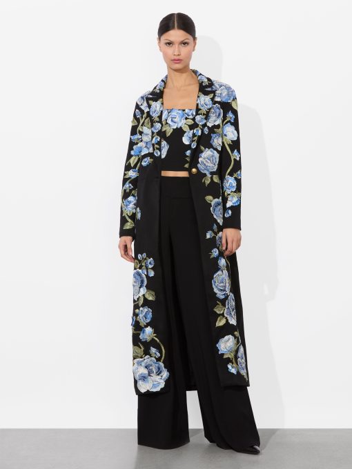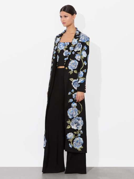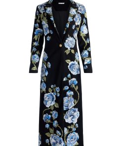 A walking work of art. This sleek long floral blazer is tailored to perfection and scattered with three-dimensional, laser-cut 3D appliques. A structured twill sateen is cut into an ankle-length blazer silhouette while lush blooms are hand-sewn for stunning visual impact. Layer over jeans and a tee for an elevated day look.