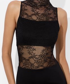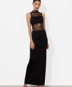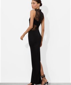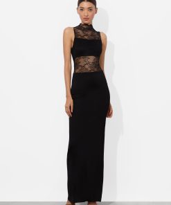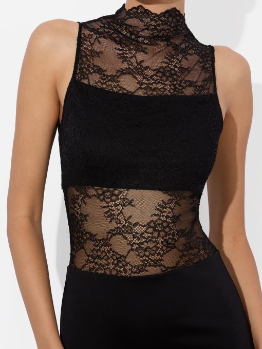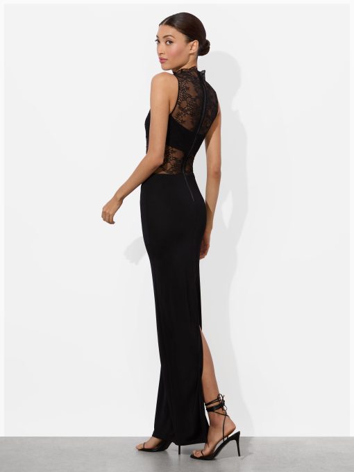 The lace bodysuit that broke the internet, now reimagined as a floor-length gown. Nichol features sheer lace paneling, a sculpted bandeau lining, and a mock neck that feels both covered and sultry. The soft stretch jersey lets it hug in all the right places, while the back slit keeps things moving. It’s romantic, sexy, and guaranteed to stun.