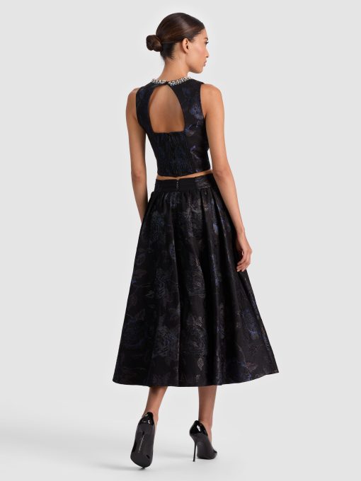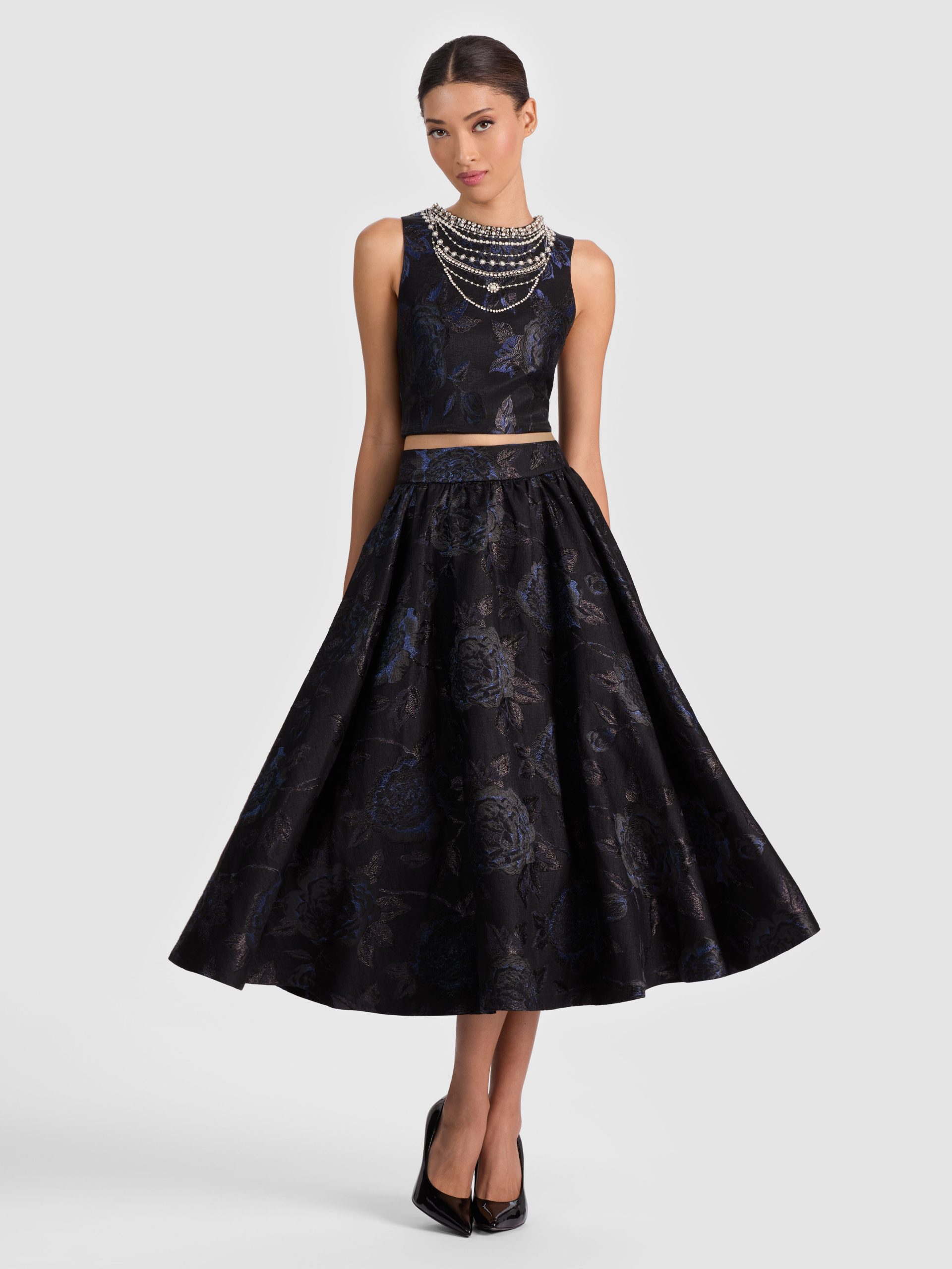 A midi skirt with a maxi impact, Nilda is crafted in a rose printed jacquard that feels so effortlessly timeless. Pair her with a simple tank to balance out the voluminous silhouette, or throw on a blazer for a more sophisticated look.