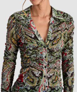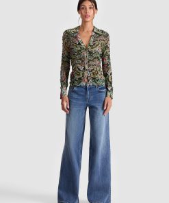 A sheer moment-with a little something extra. The Portia ruched button down takes your classic silhouette and levels it all the way up with a mesh body, ruched detailing, a sharp collar, and a swirling paisley print that feels equal parts retro and rebellious. Fitted and slightly sheer, it’s made for layering (or not) depending on your mood. Whether you wear it under a blazer, over a bralette, or buttoned up solo, it’s the kind of piece that brings instant texture, edge, and conversation.