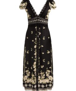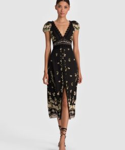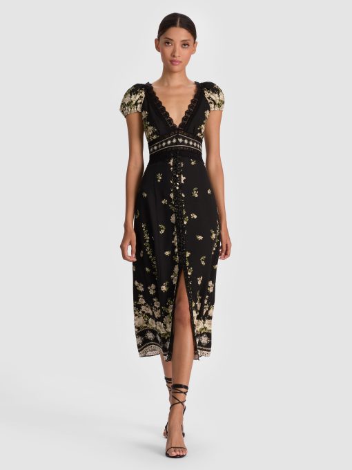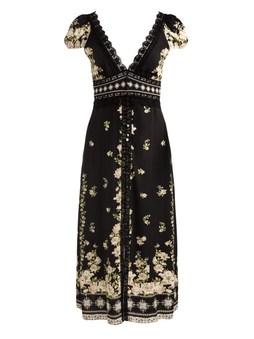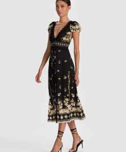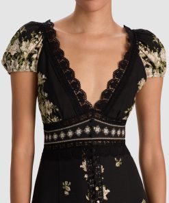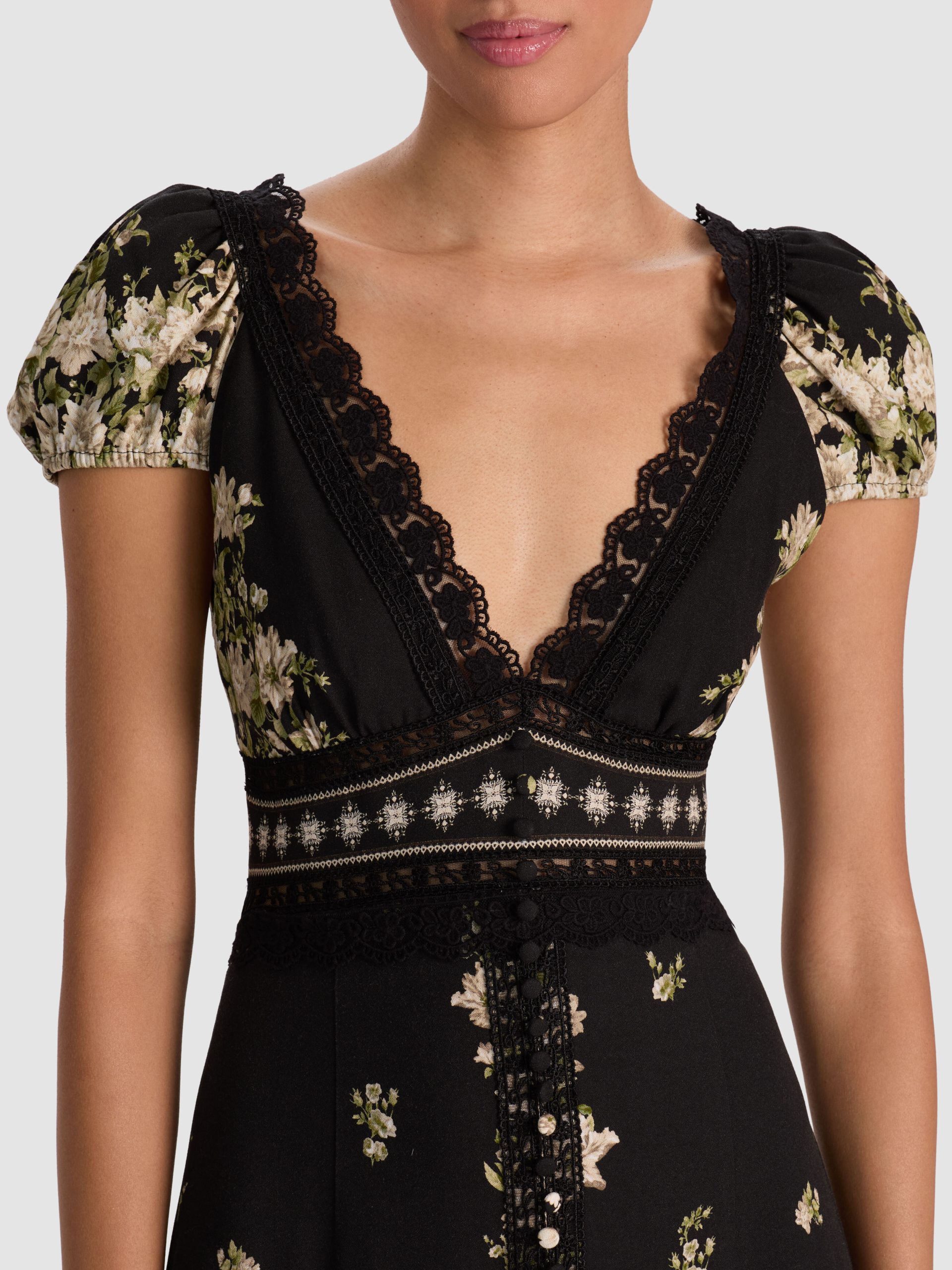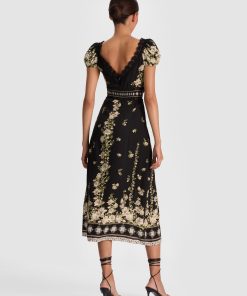 Rose takes the classic midi and elevates it with a scalloped lace trim, puff sleeves, and delicate buttons that feel like heirloom touches. A deep-V neckline at the front and back keeps things flirty, while the A-line cut flatters every step. Feminine and sophisticated, it’s the kind of dress that shifts effortlessly from weddings to dinner parties to nights out.