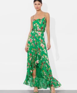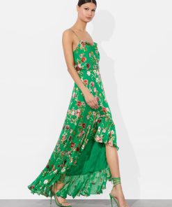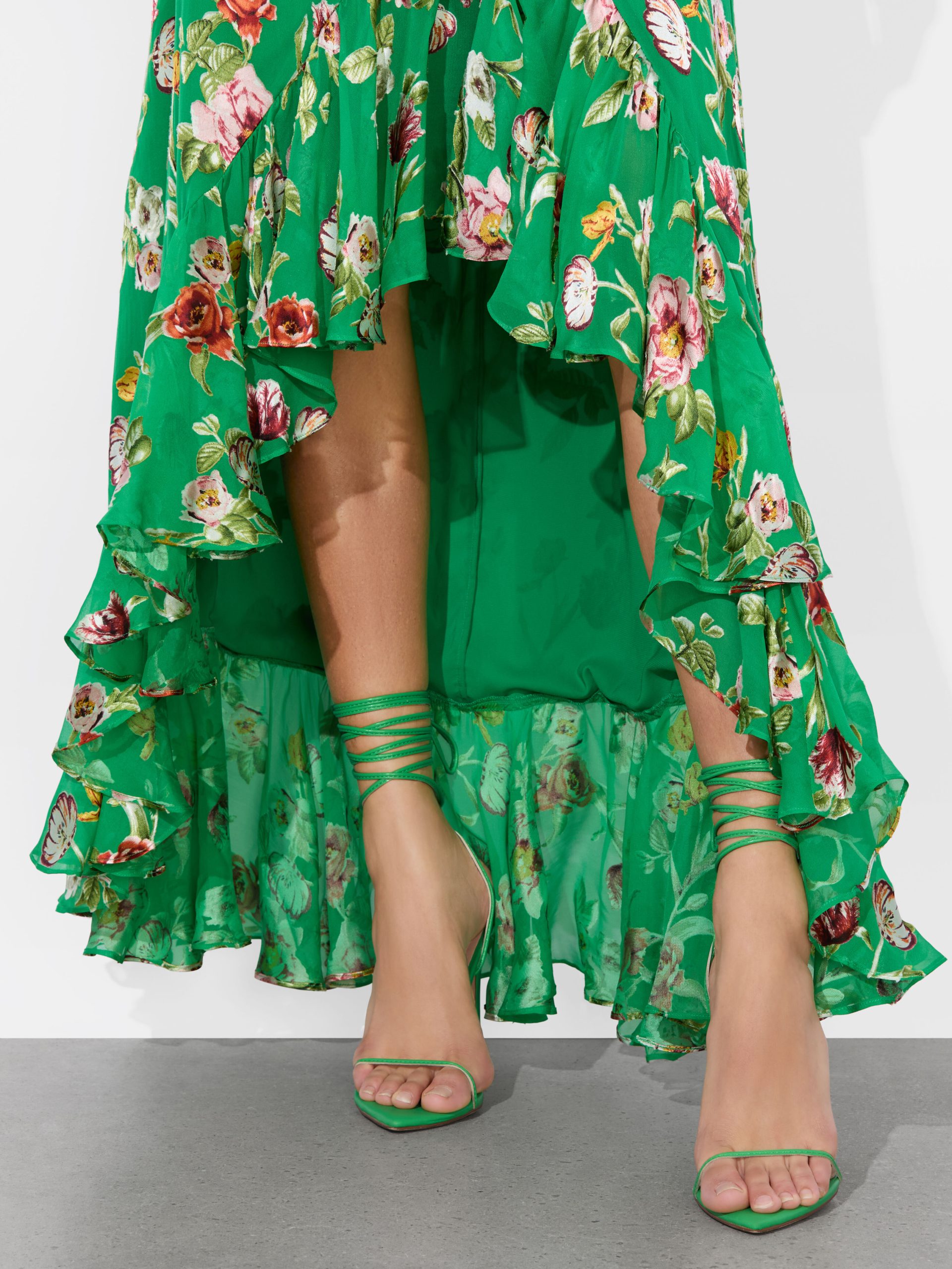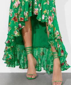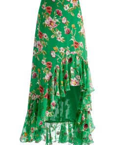 Flirty, floaty, and made to be noticed- this high-low stunner is crafted from rich silk satin burnout with a dimensional floral texture that catches the light (and the compliments). The faux-wrap silhouette is trimmed with cascading ruffles that move like a breeze, creating a romantic, feminine drape. Fully lined for ease, this green floral skirt is made for rooftop cocktails, candlelit dates, and any night that deserves a little drama.