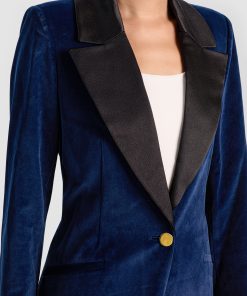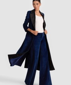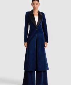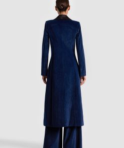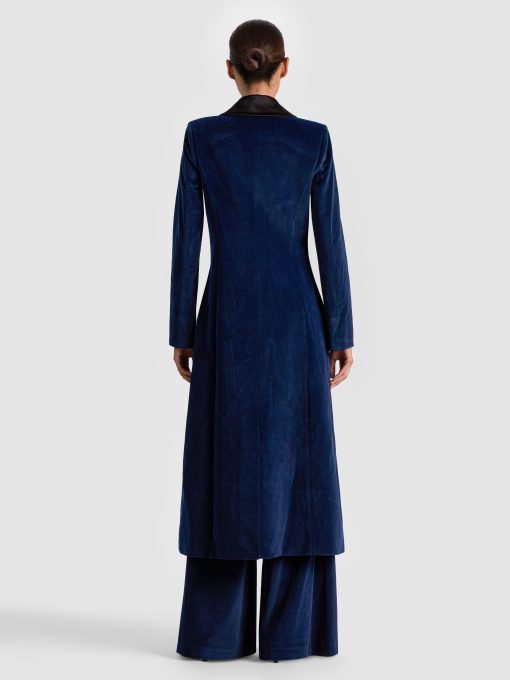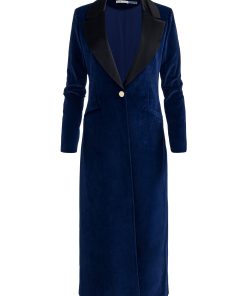 Make an entrance. This maxi-length velvet coat is designed with strong shoulders, a sleek notch collar, and contrast satin lapels that add just the right amount of shine. The gold button closure and long, dramatic lines feel regal, while the rich velvet adds undeniable luxe. A true statement layer, it’s the perfect companion to the velvet Olivia pant or thrown over anything for instant drama.