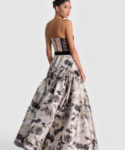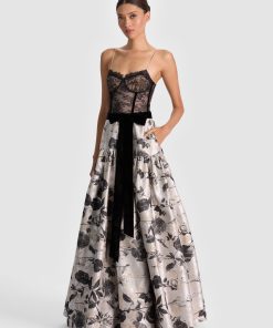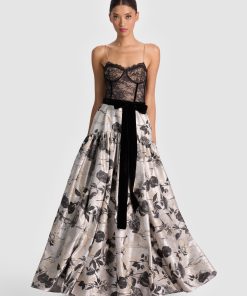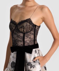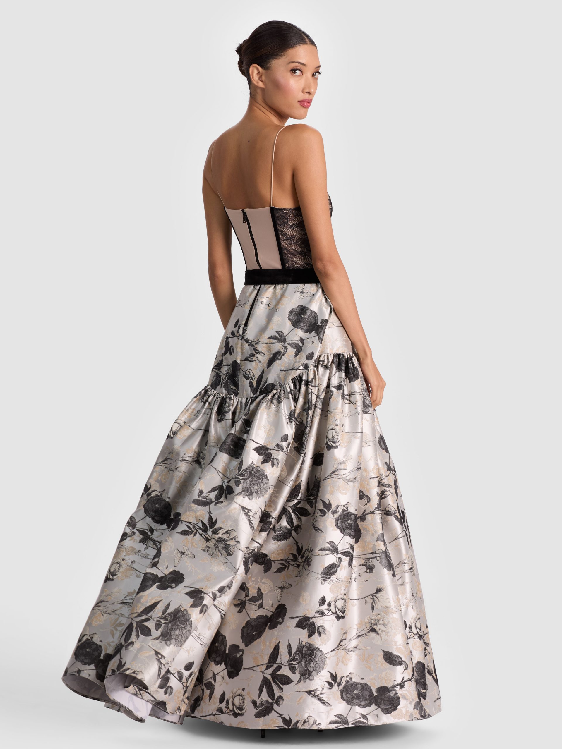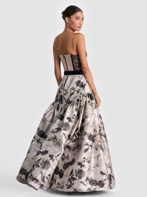 This one was made for a grand entrance. A Chantilly lace bustier meets a voluminous jacquard skirt in cascading tiers in our Thera. It’s cinched at the waist with a detachable velvet bow belt for extra drama. Equal parts playful and elegant, it turns an evening into a memory. When you want your dress to do the talking- and the remembering- Thera delivers the spotlight.