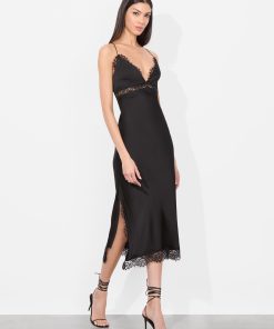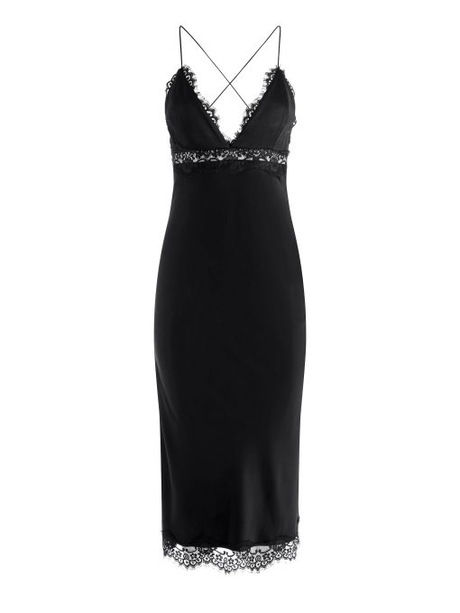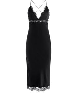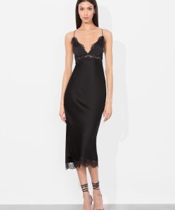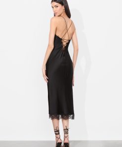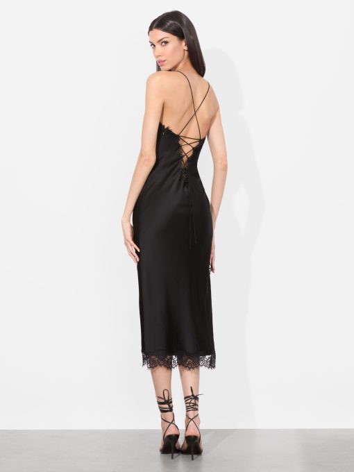 Sultry meets sophistication in this midi slip dress, crafted from glossy stretch viscose that skims the body with a fluid, second-skin feel. Lace trim details the plunging neckline, hem, and underbust cut-out for a romantic touch. An open back with criss-cross lacing offers a customizable fit, while a discrete side zipper and subtle side slit ensure ease and movement.